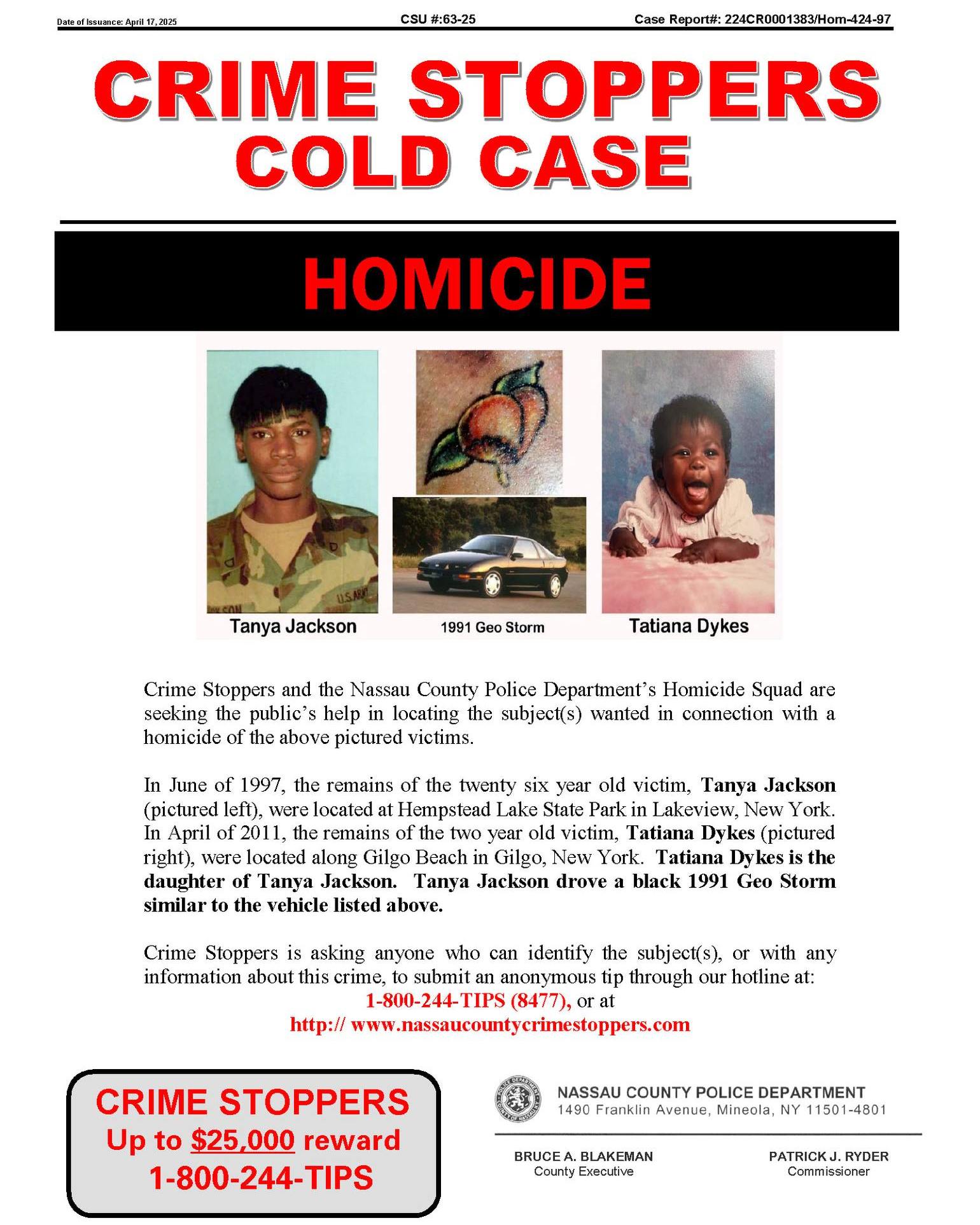 - June 1997, remains of the 26-year-old victim, Tanya Jackson (left) were located at Hempstead Lake State Park in Lakeview In April 2011, remains of the 2-year-old victim, Tatiana Dykes (right) were located along Gilgo Beach.