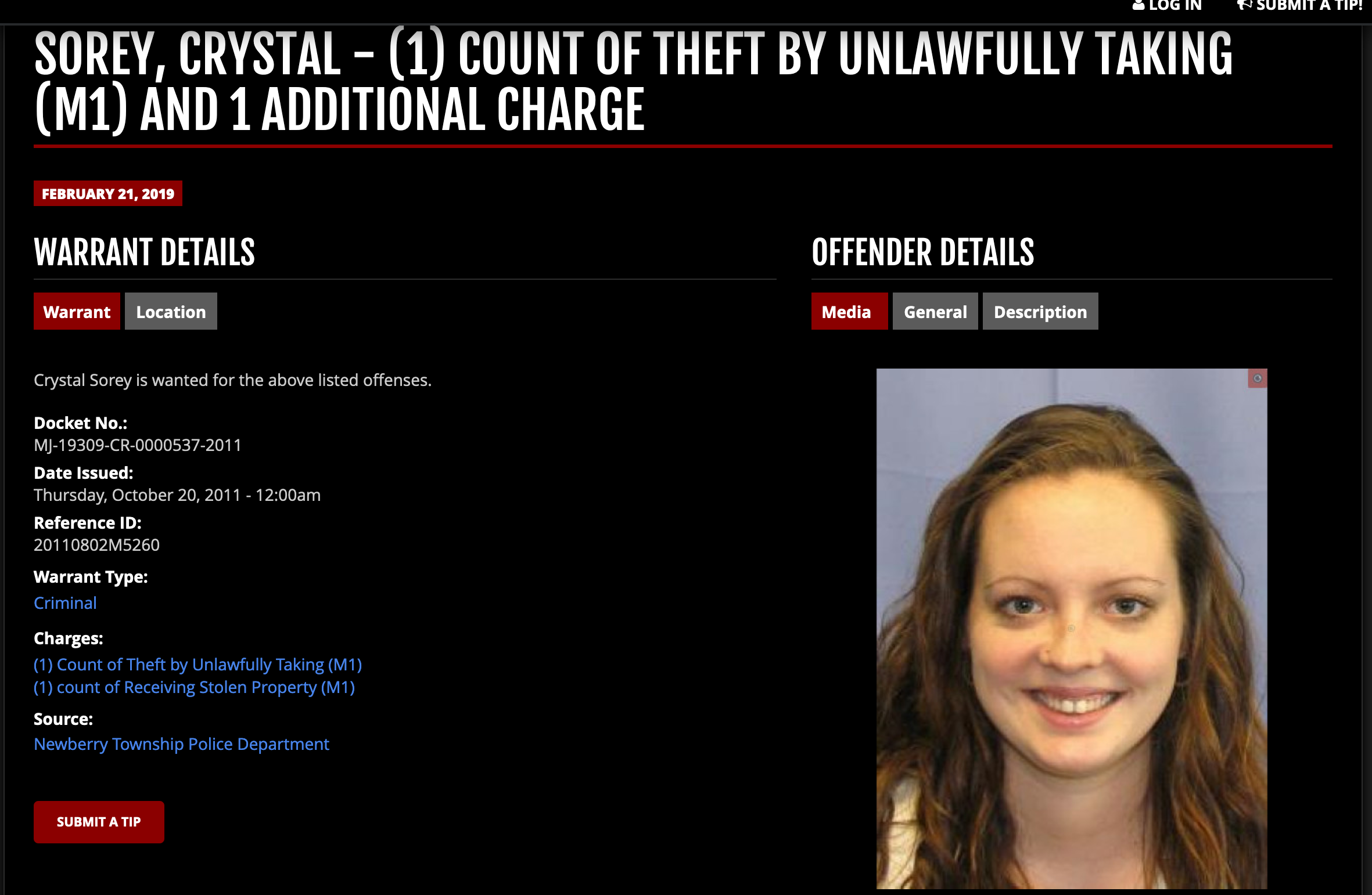 Crystal is arrested twice for theft and receiving stolen property in York, PA..