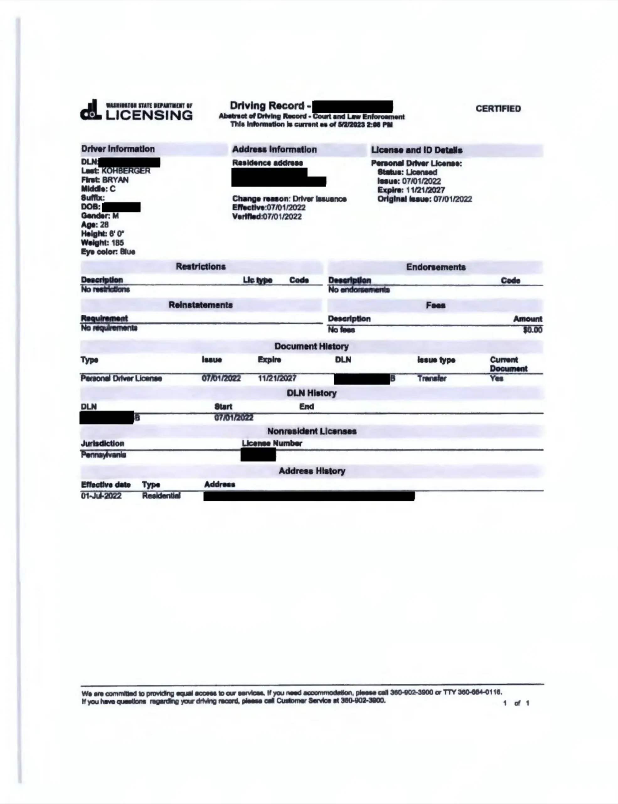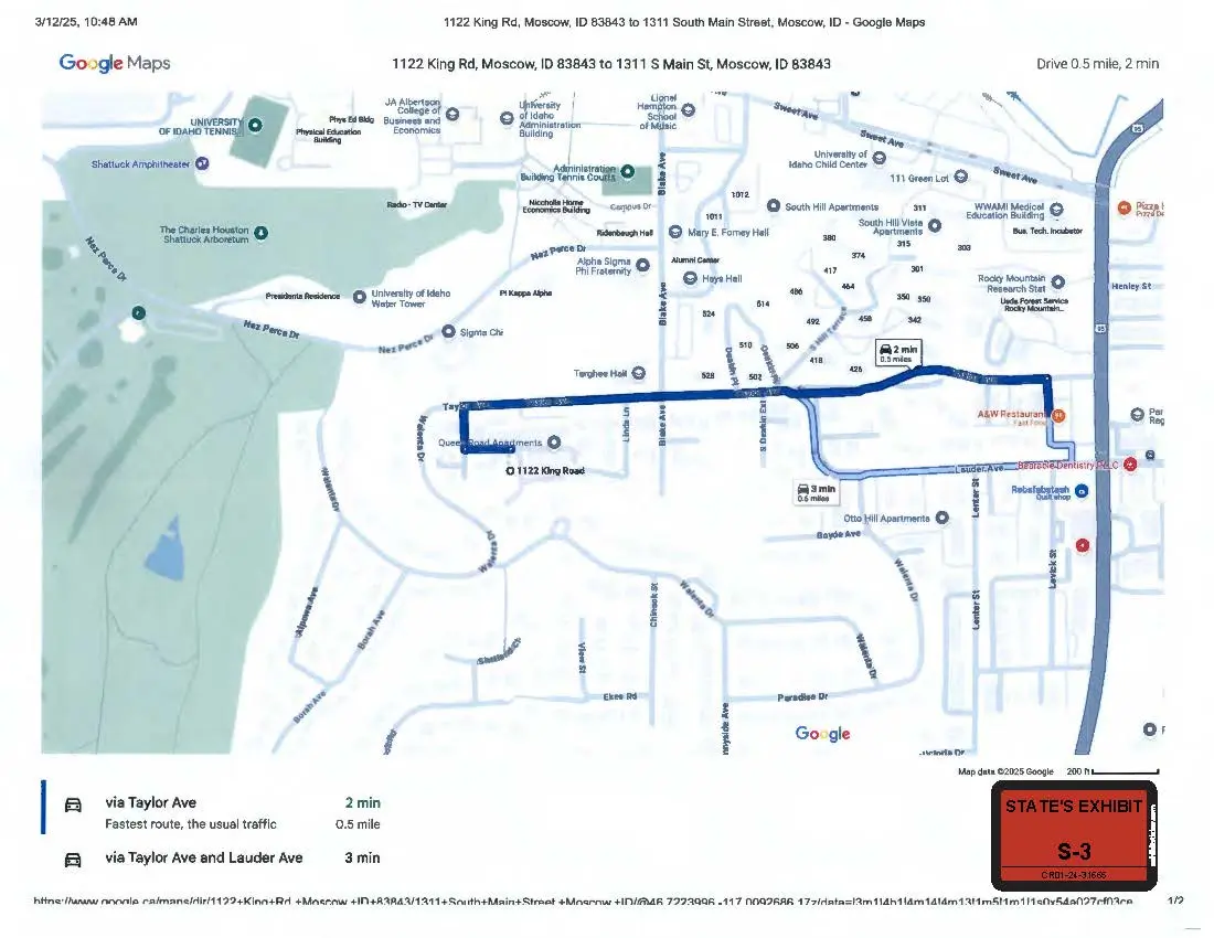 - 2:53 AM: The same white sedan is seen traveling southeast on Nevada Street, heading toward State Route 270 (SR 270), which connects Pullman, WA, to Moscow, ID.