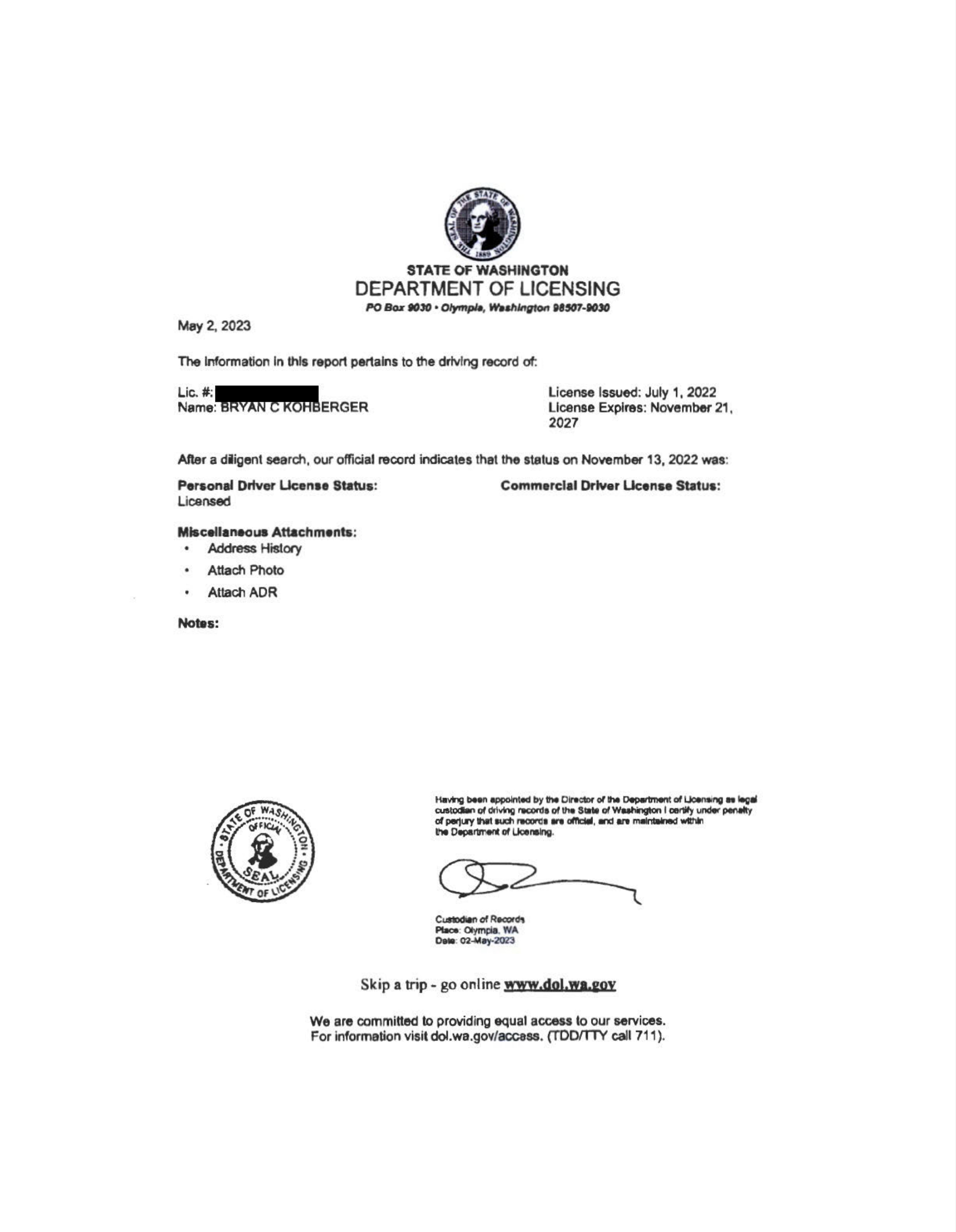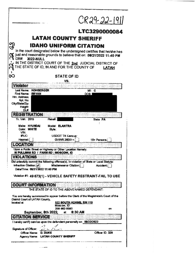 - 2:44 AM: A white sedan (BK’s Vehicle) was captured on Washington State University (WSU) campus surveillance traveling north on Southeast Nevada Street at Northeast Stadium Way in Pullman, WA.