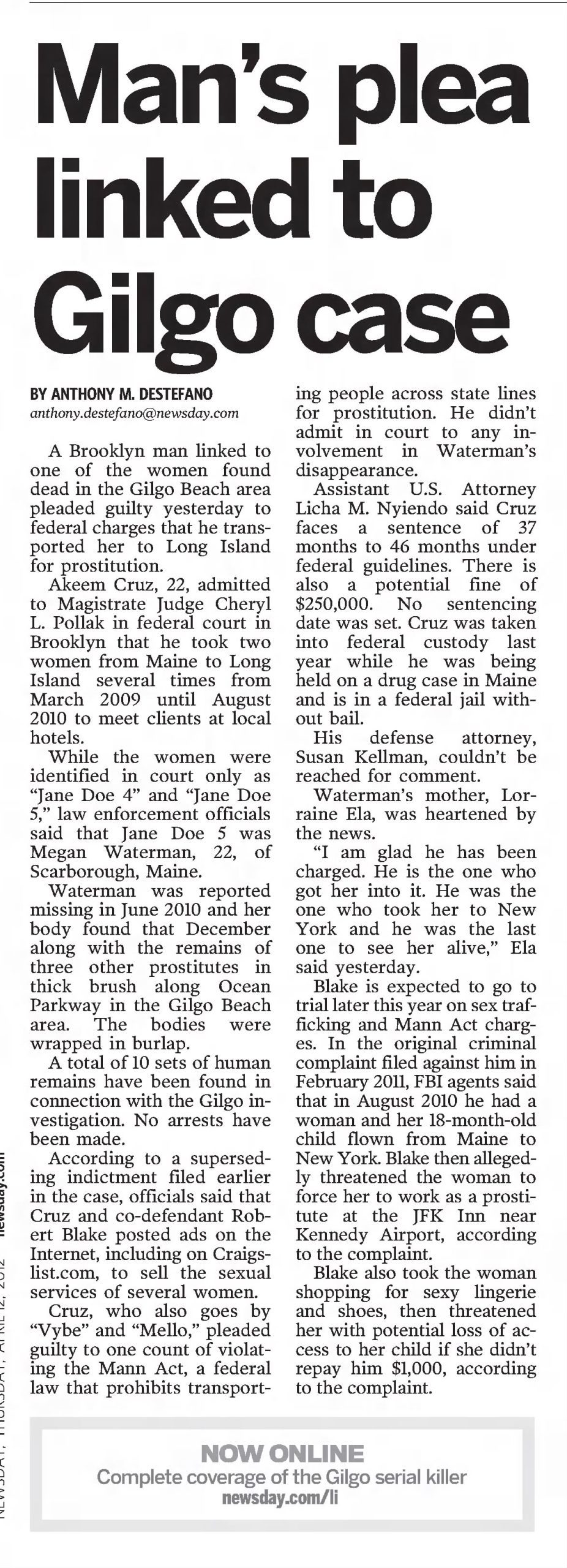 Akeem Cruz of Brooklyn was accused of bringing Maine resident Megan Waterman to New York to work as a prostitute; Waterman was later found dead, a victim of a suspected seriel killer.