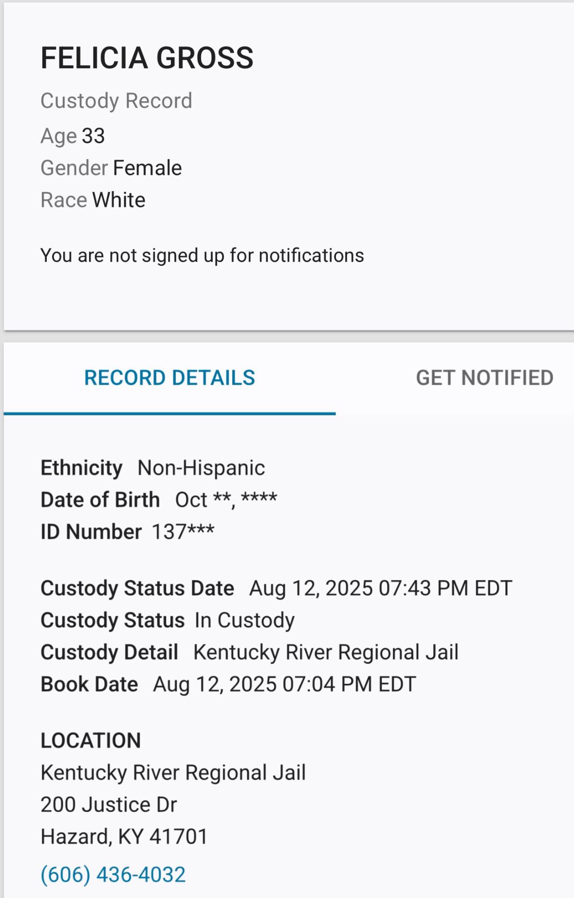 - Custody Status: She was booked to the Kentucky River Regional Jail in Perry County.