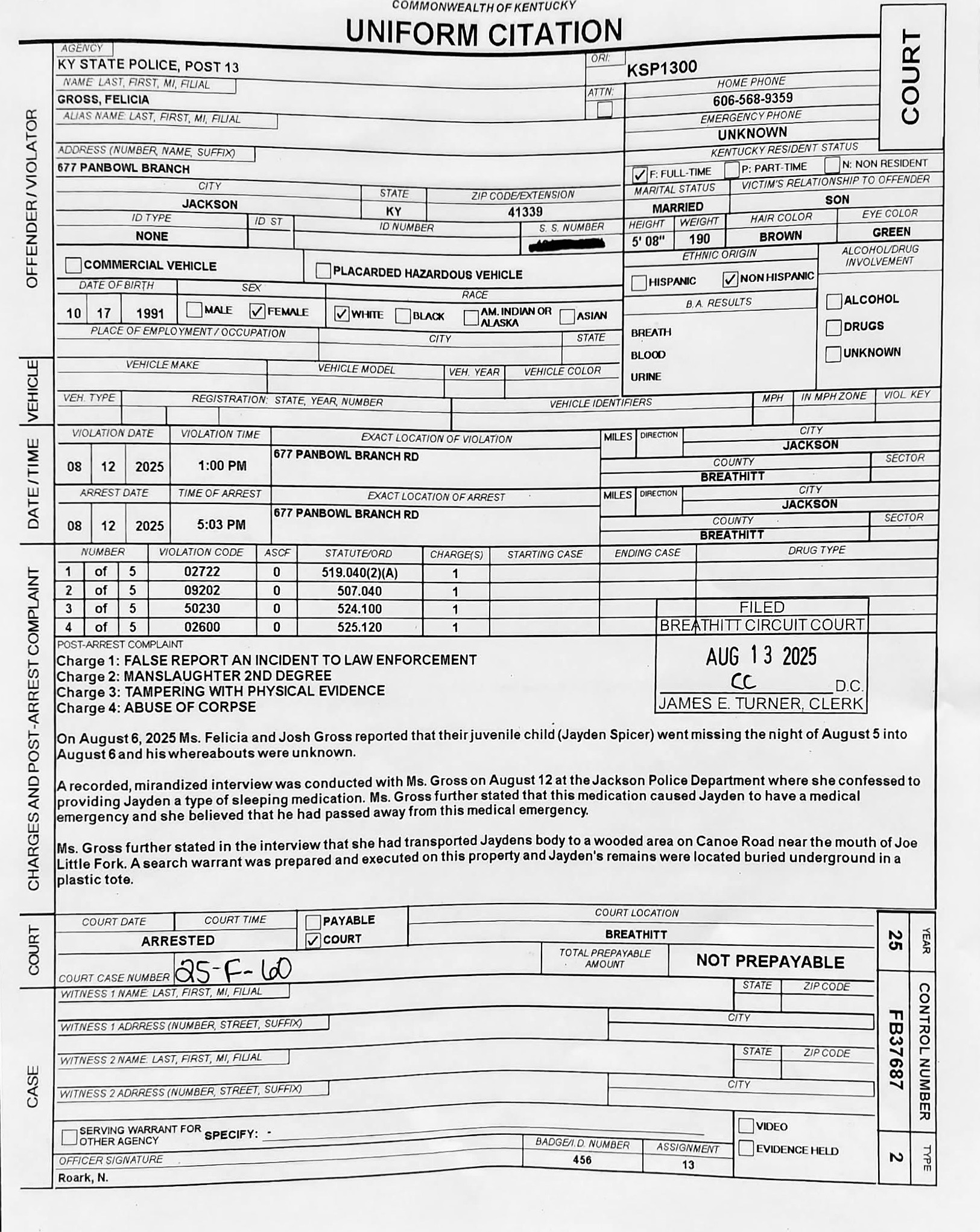 - Jaden’s mother, Felicia A. Gross, 33, of Jackson, was taken into custody and transported to the Kentucky River Regional Jail. She is charged with Manslaughter in the Second Degree, Abuse of a Corpse, Tampering with Physical Evidence and Falsely Reporting an Incident. This investigation remains ongoing and is being led by Detective Nathan Roark.