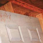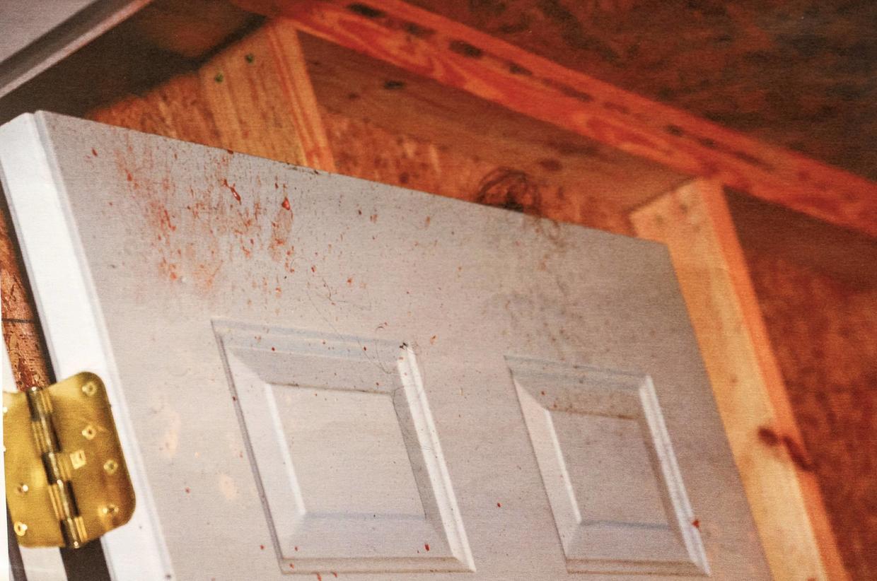 - there was high-velocity blood splatter on the upper half of the open door and ceiling area just inside the doorway.