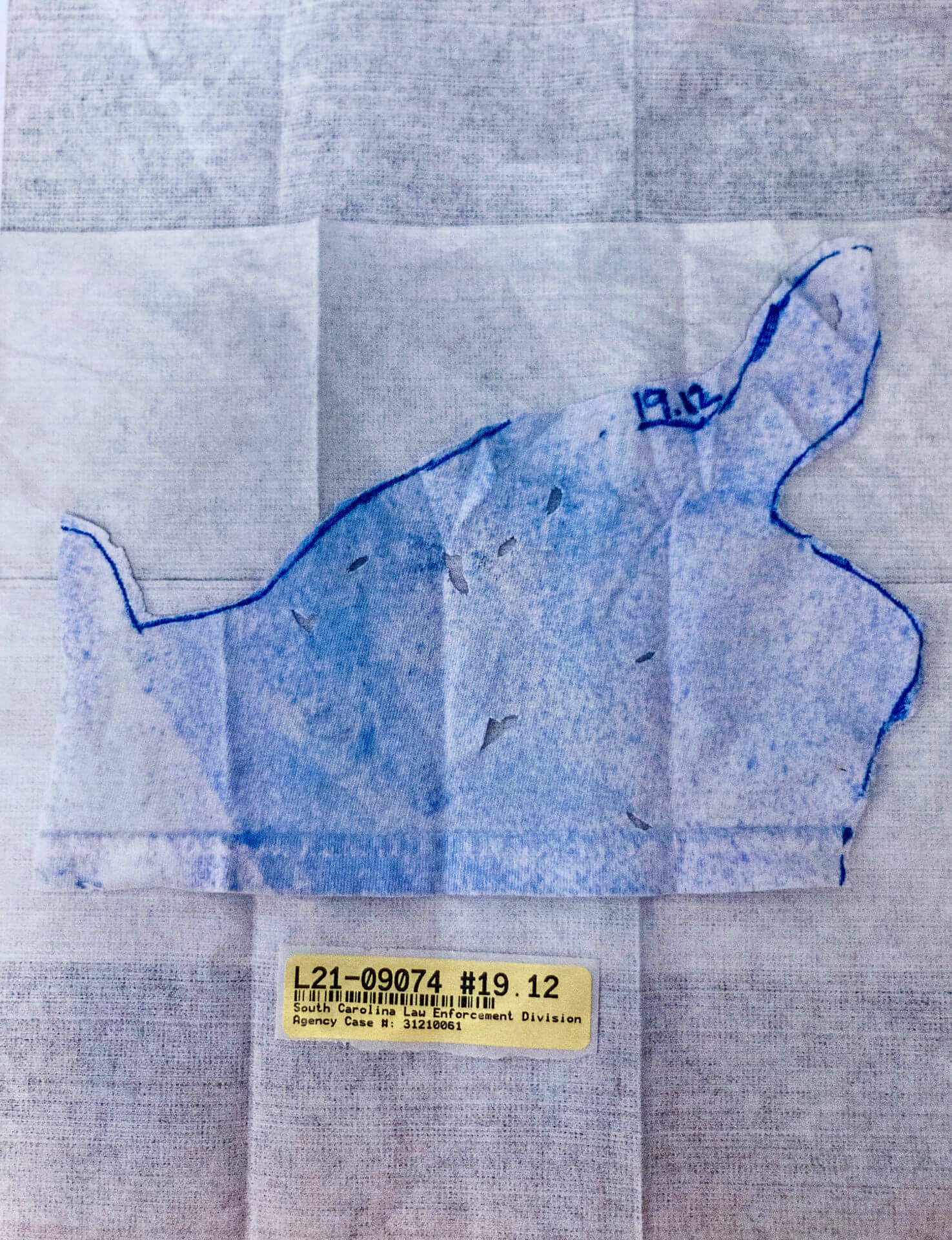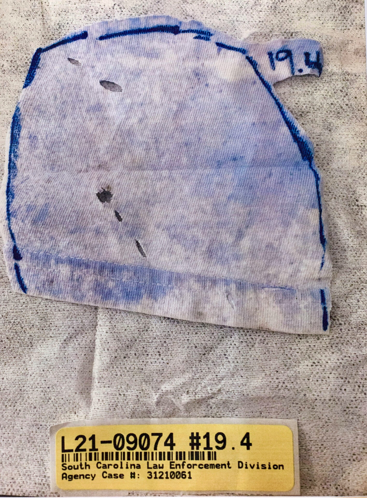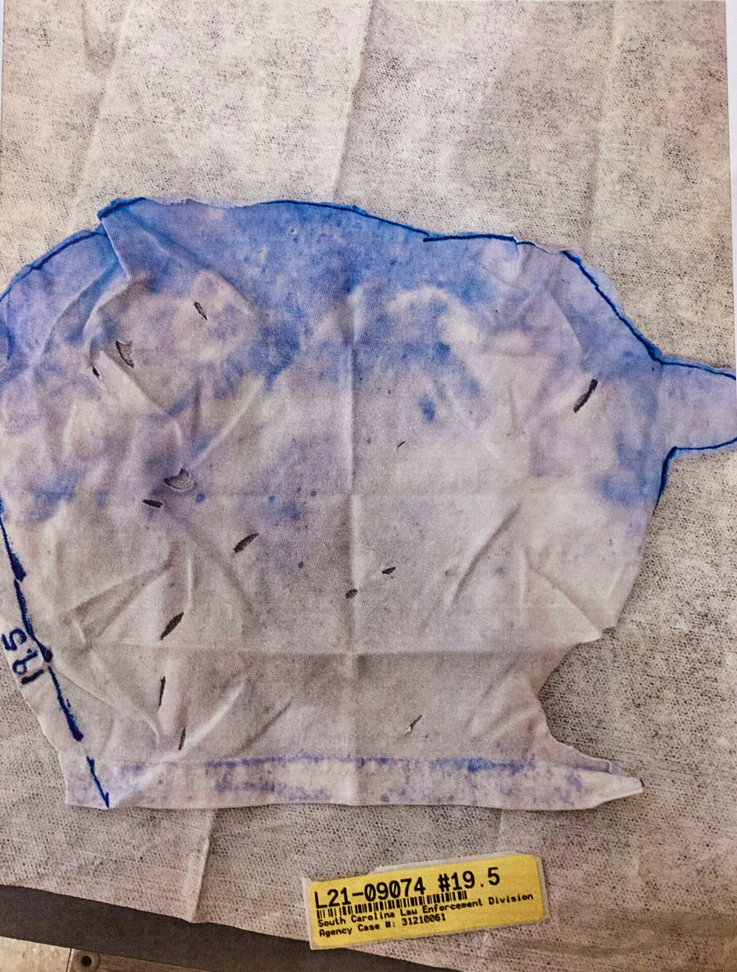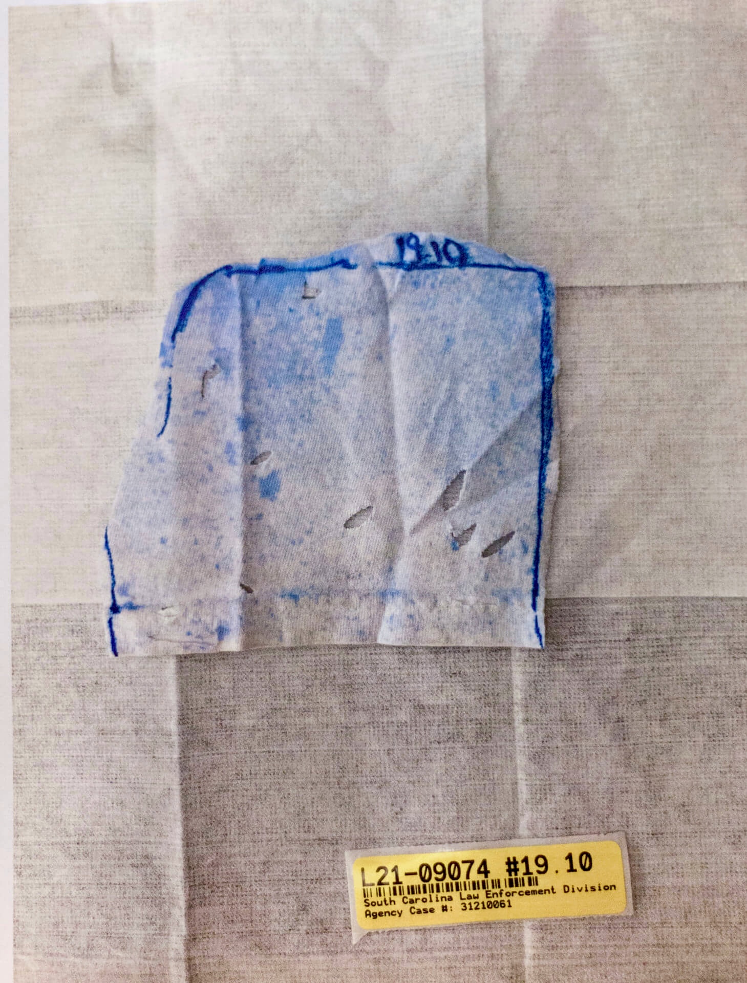The white T-shirt Alex was wearing is tested for gunshot primer residue (GSR). Only three particles of GSR are found, which SLED analysts believe is consistent with transfer from recently holding a firearm and not necessarily indicative of having recently fired a firearm.