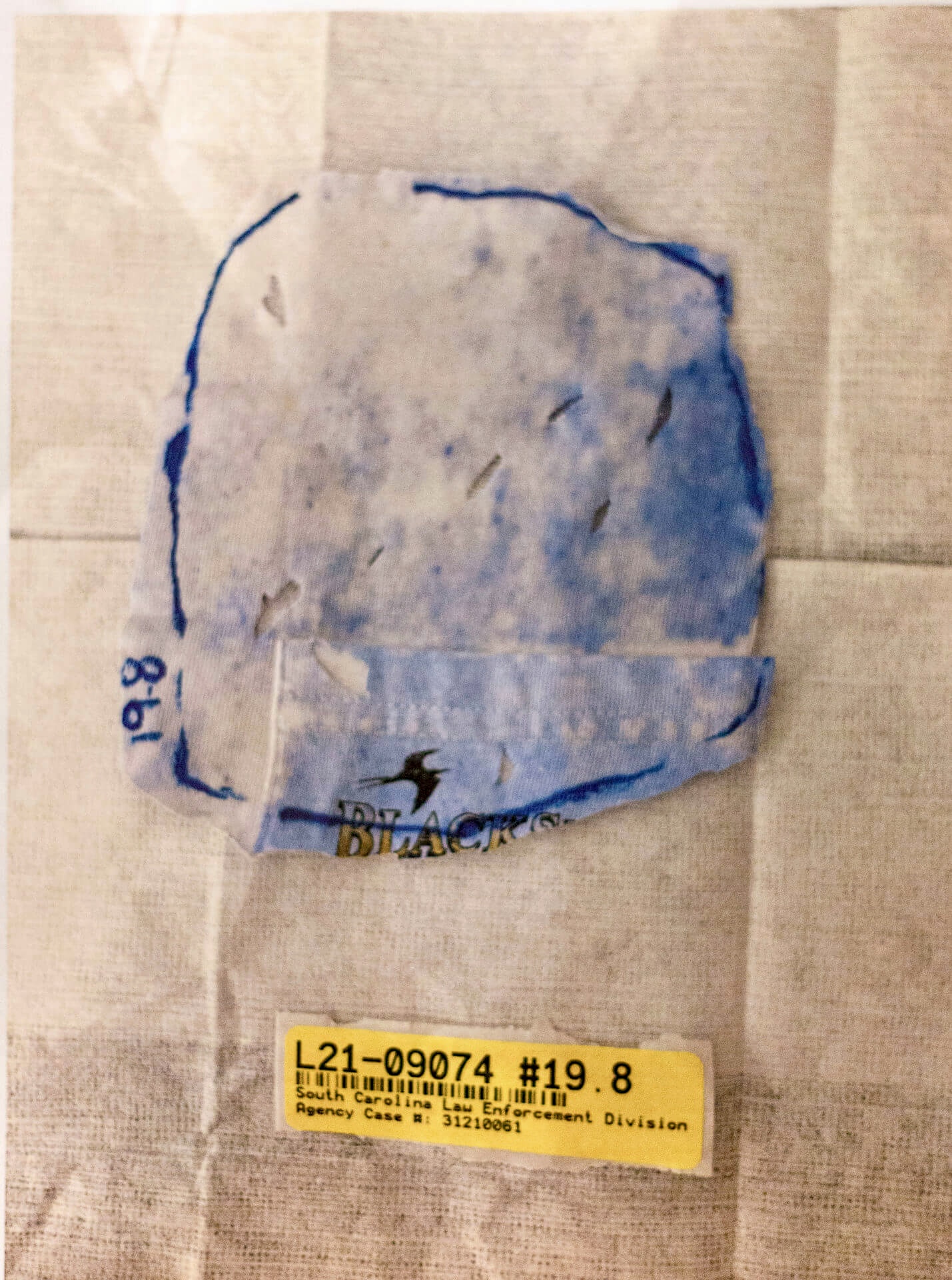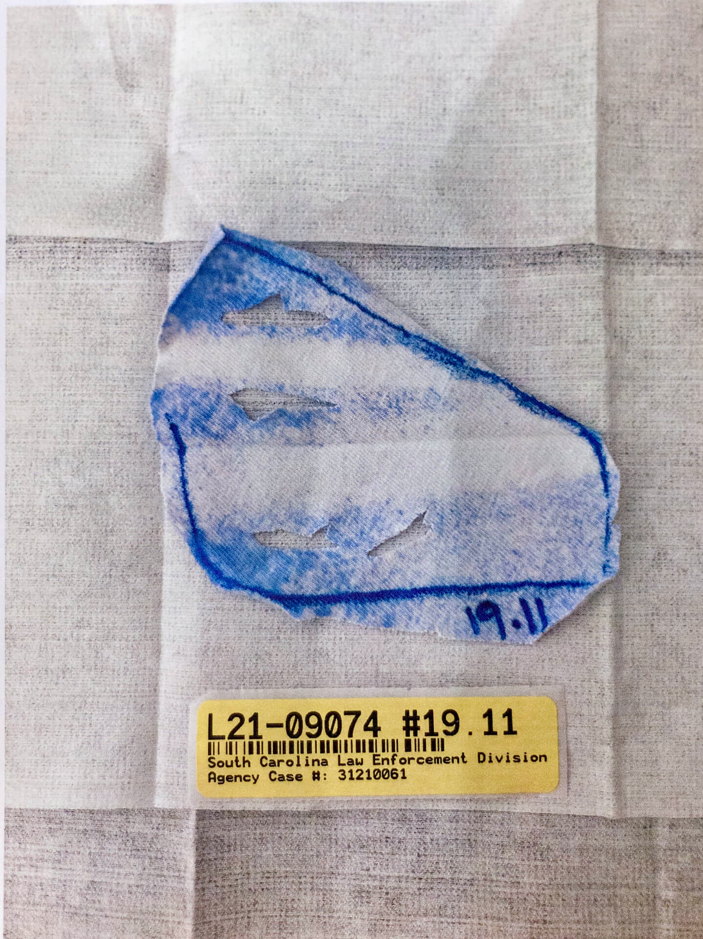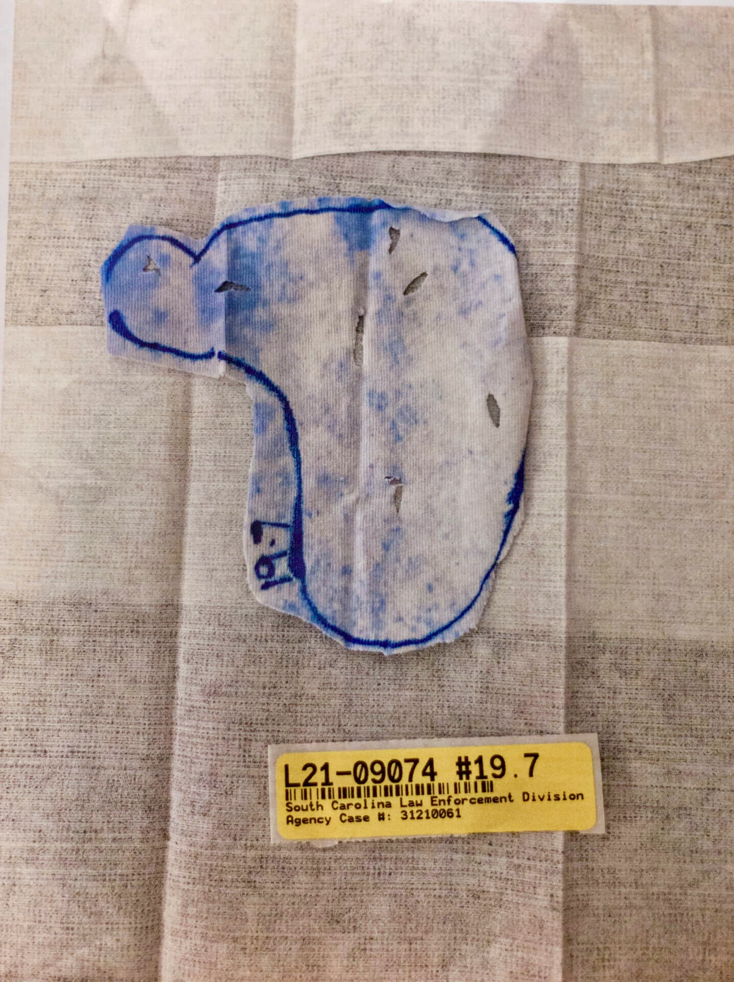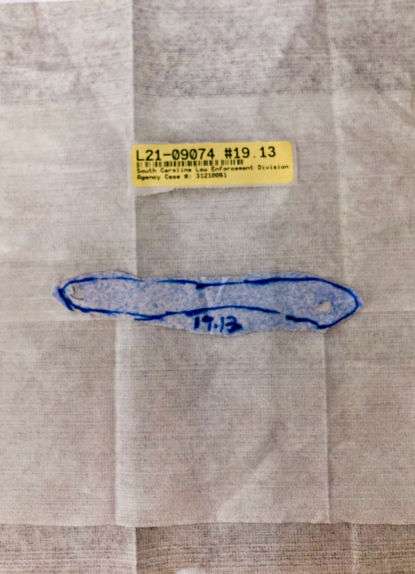 The white T-shirt Alex was wearing is tested for gunshot primer residue (GSR). Only three particles of GSR are found, which SLED analysts believe is consistent with transfer from recently holding a firearm and not necessarily indicative of having recently fired a firearm.