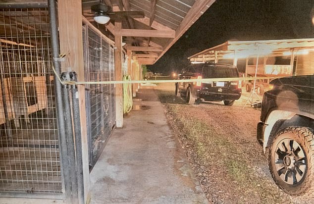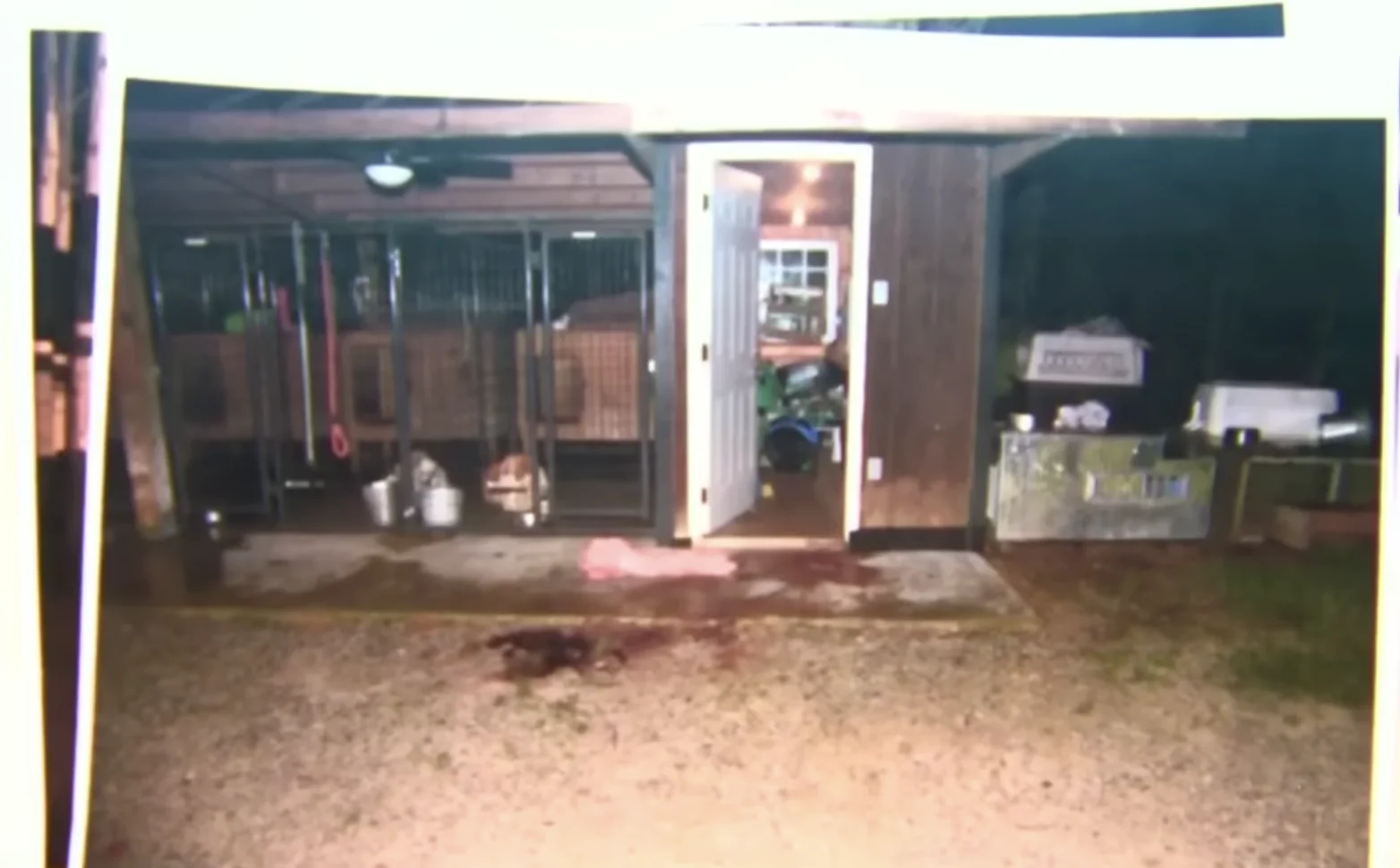 The body of an adult male was observed face down in the open doorway to a feed room that was positioned at the end of a long run of dog kennels.