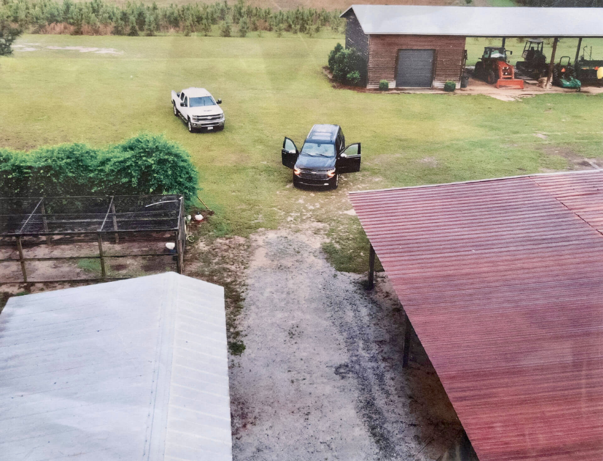 The deceased female was approximately 20-30 feet (estimate) from the male’s body, located at the end of a carport section of a large workshop type building. She too had a traumatic head injury, along with what appeared to be gunshot wounds to the upper right back, lower left back and right leg.