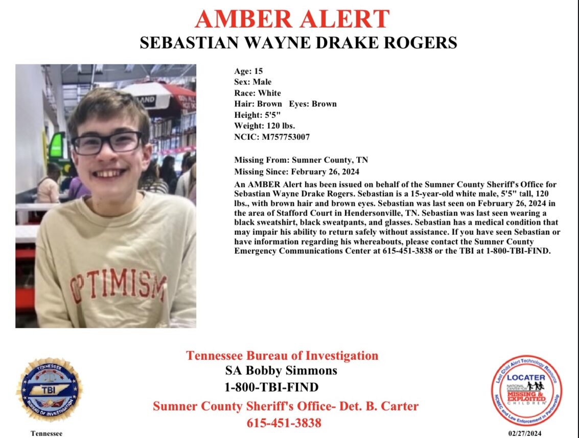 Amber Alert has been issued on behalf of the Sumner County Sheriffs Office for Sebastian Wayne Drake Rogers. Sebastian is a 15-year-old white male, 5’5″ tall, 120lbs., with brown hair and brown eyes. Sebastian was last seen on February 26, 2024 in the area of Stafford Court in Hendersonville, TN.