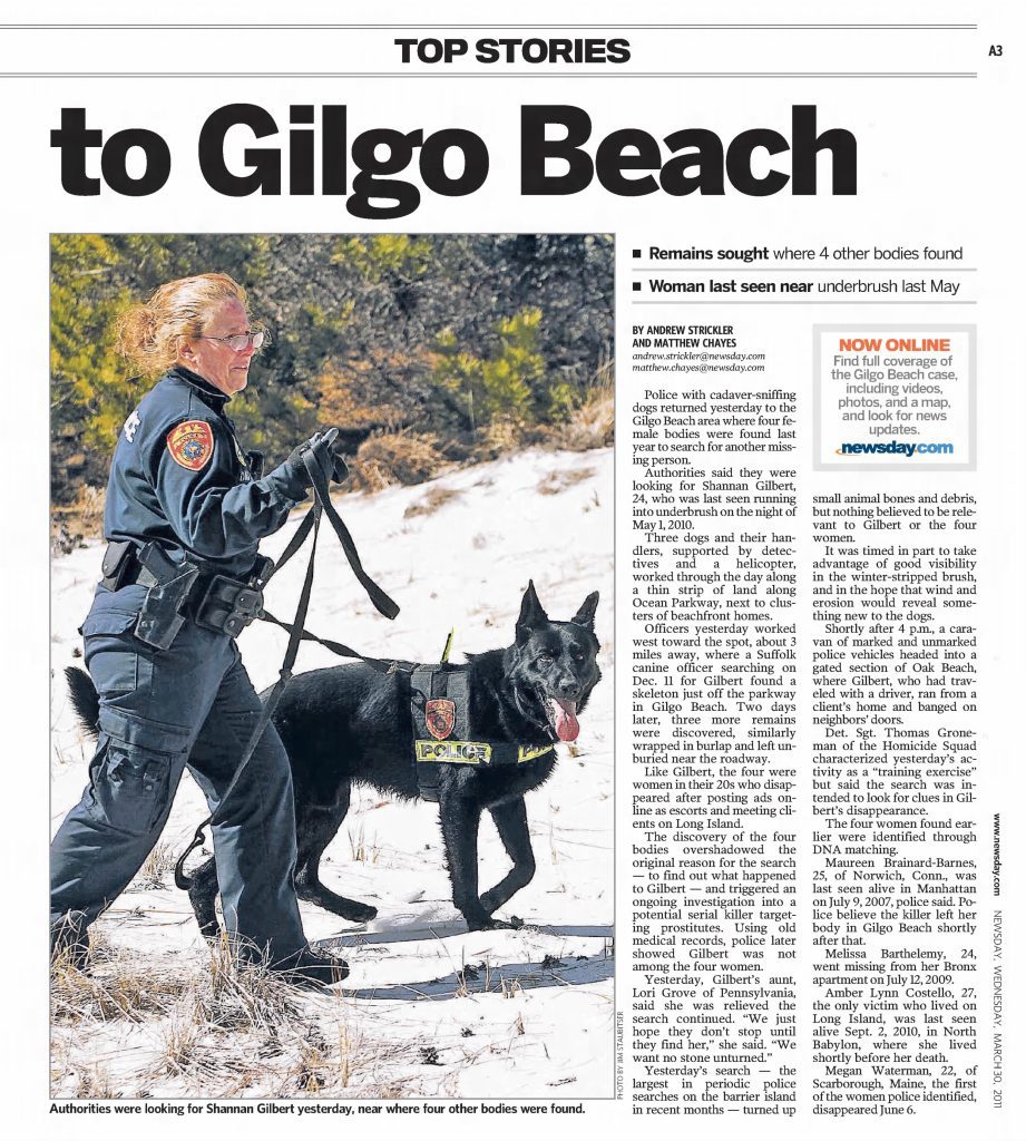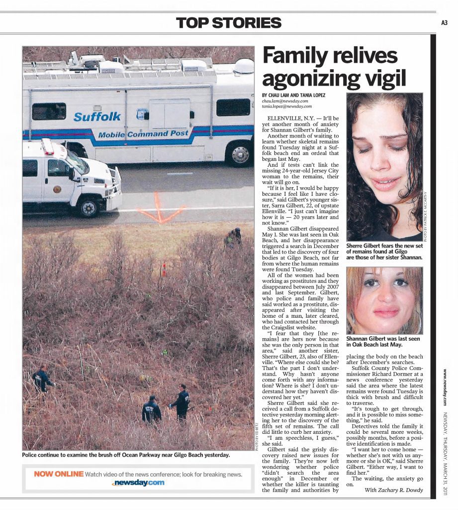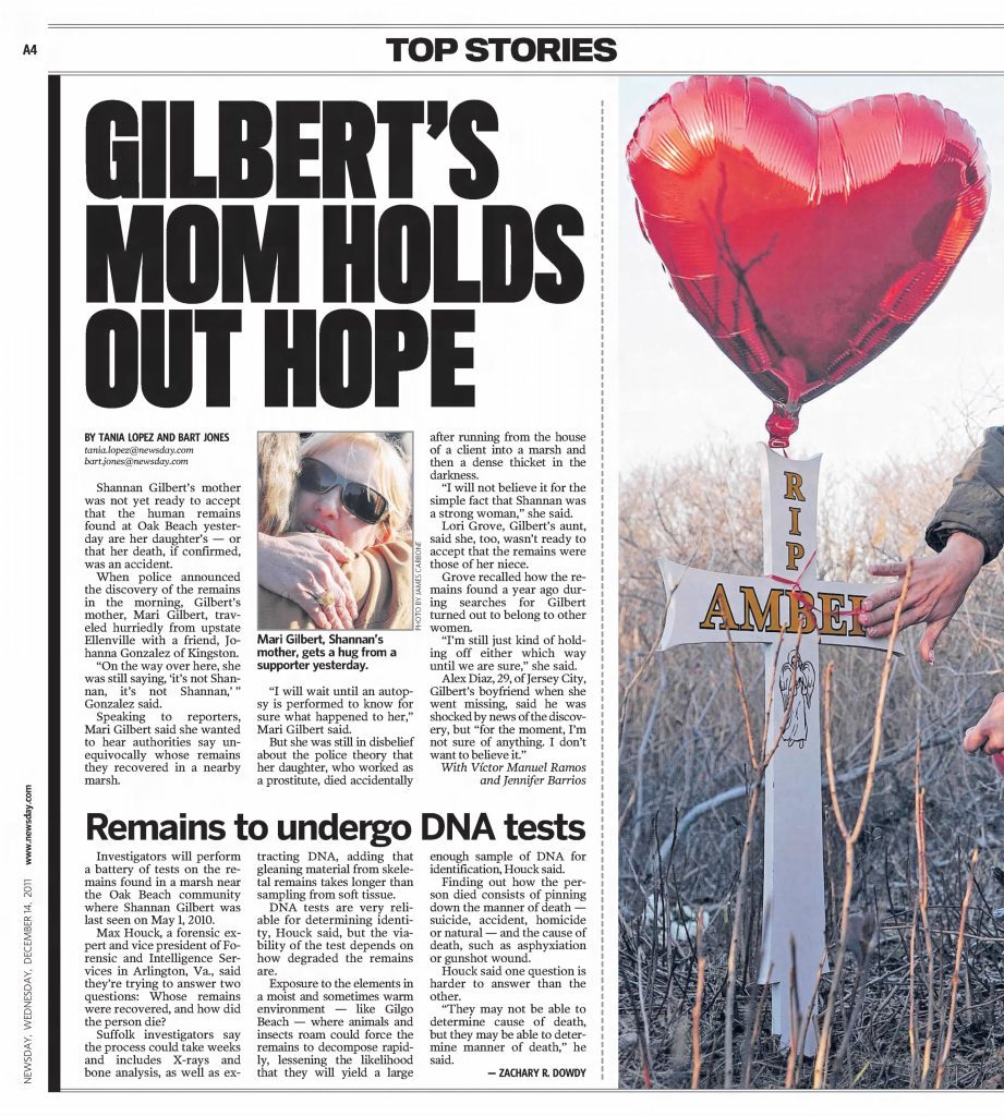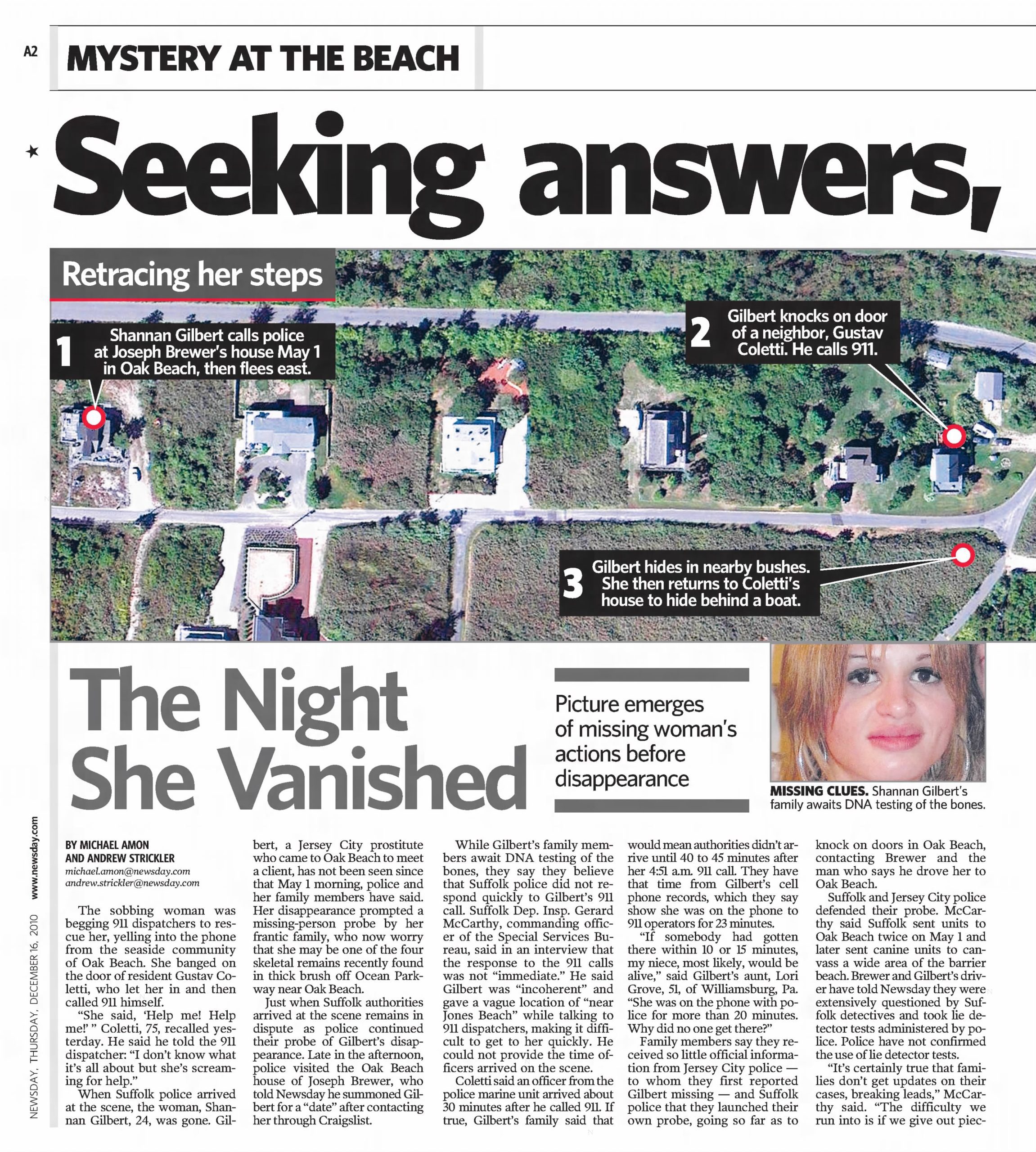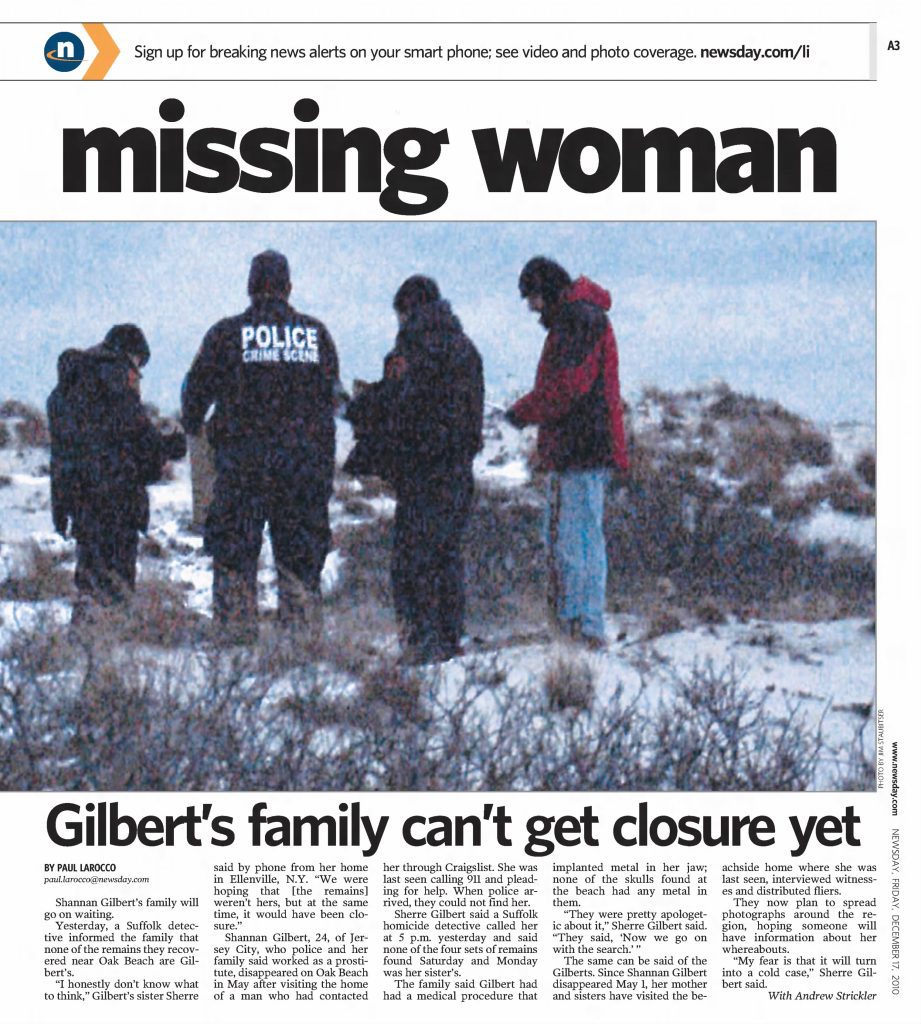 Gilbert, who had been working as an escort, was reported to have fled from a client’s home in a state of distress. Her remains were eventually found in a wooded area in Oak Beach, Long Island, in December 2011.