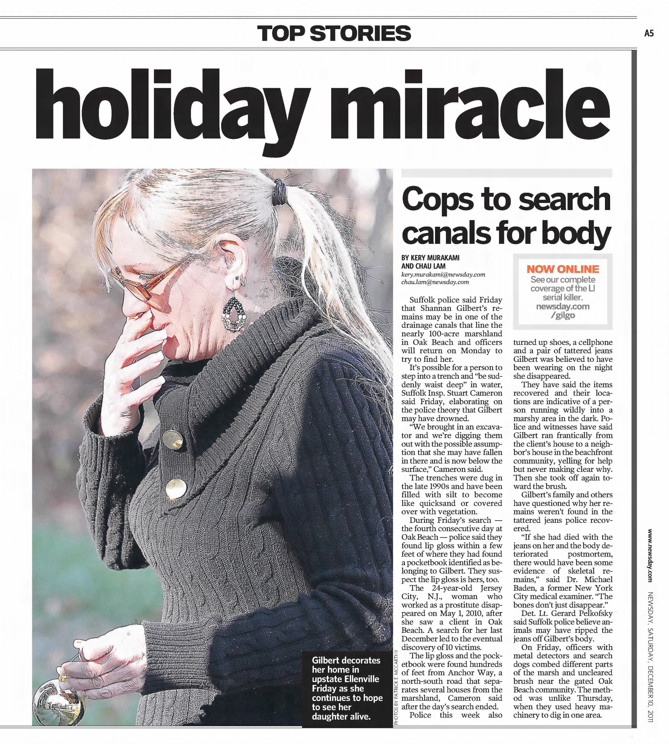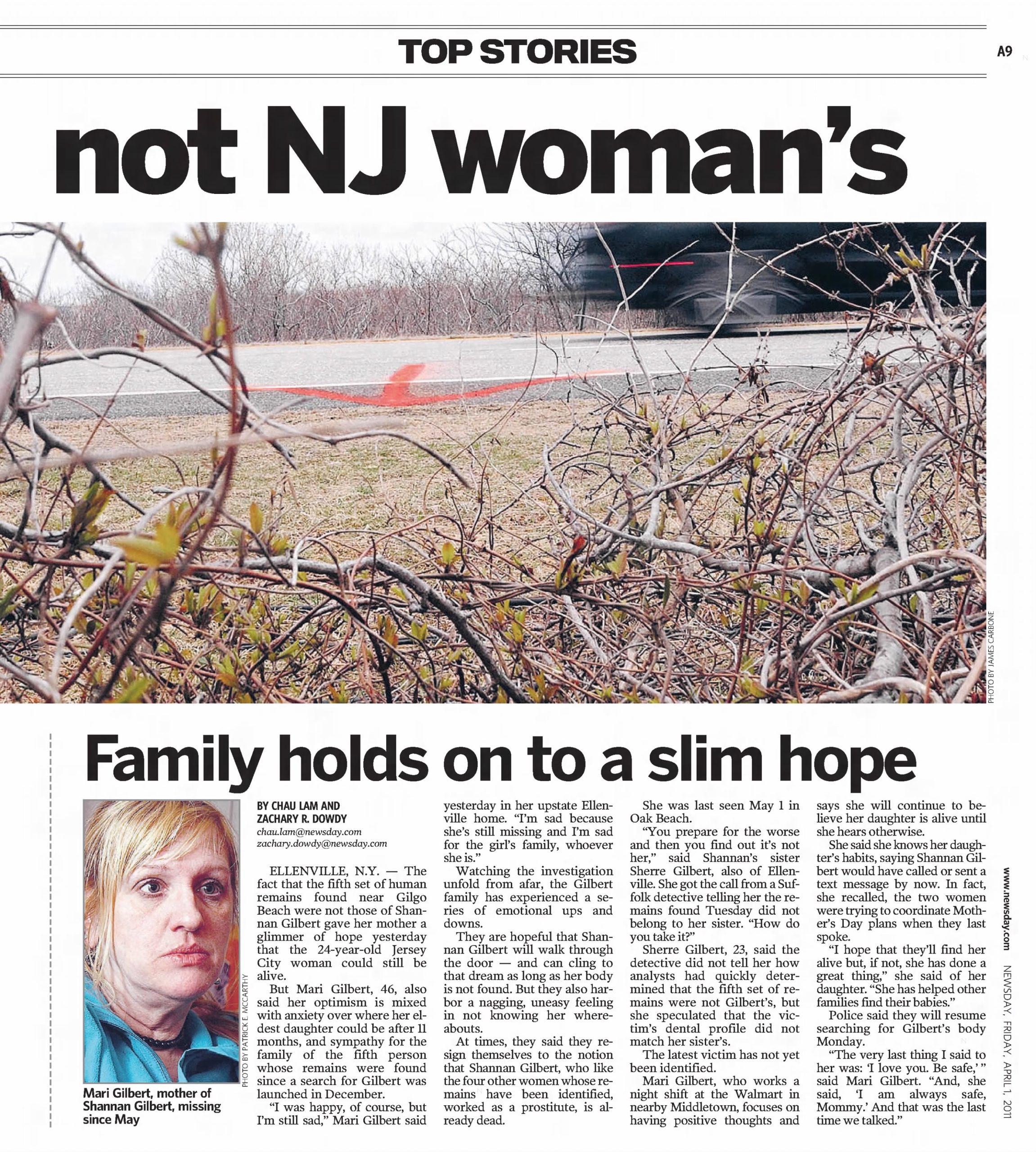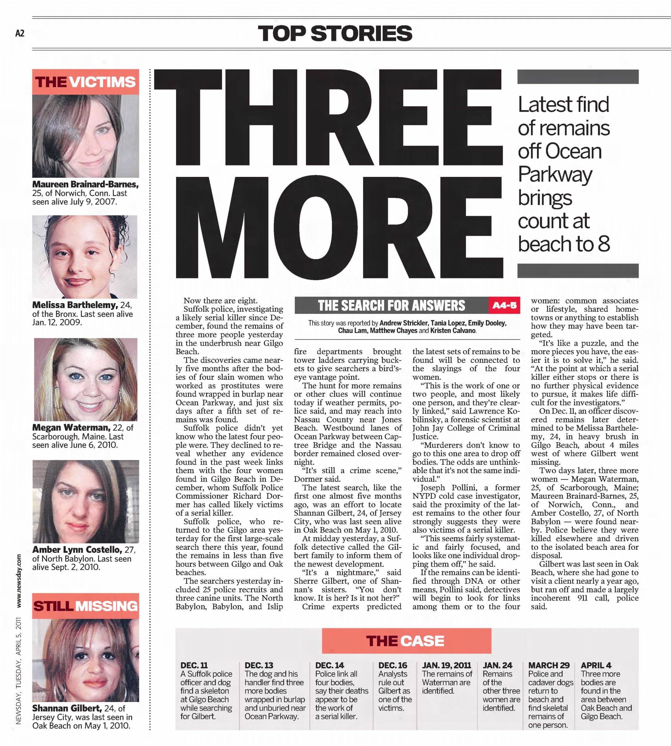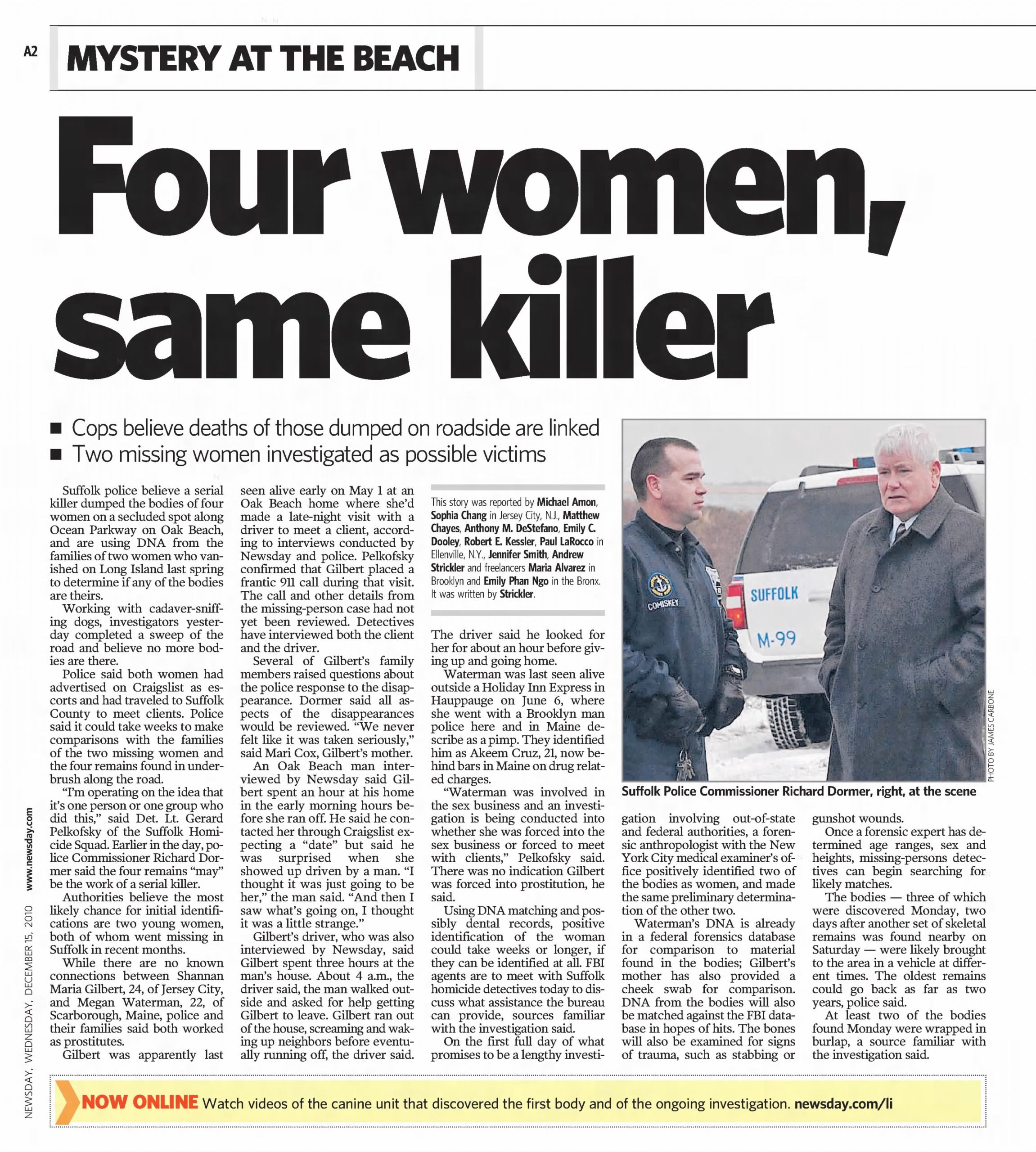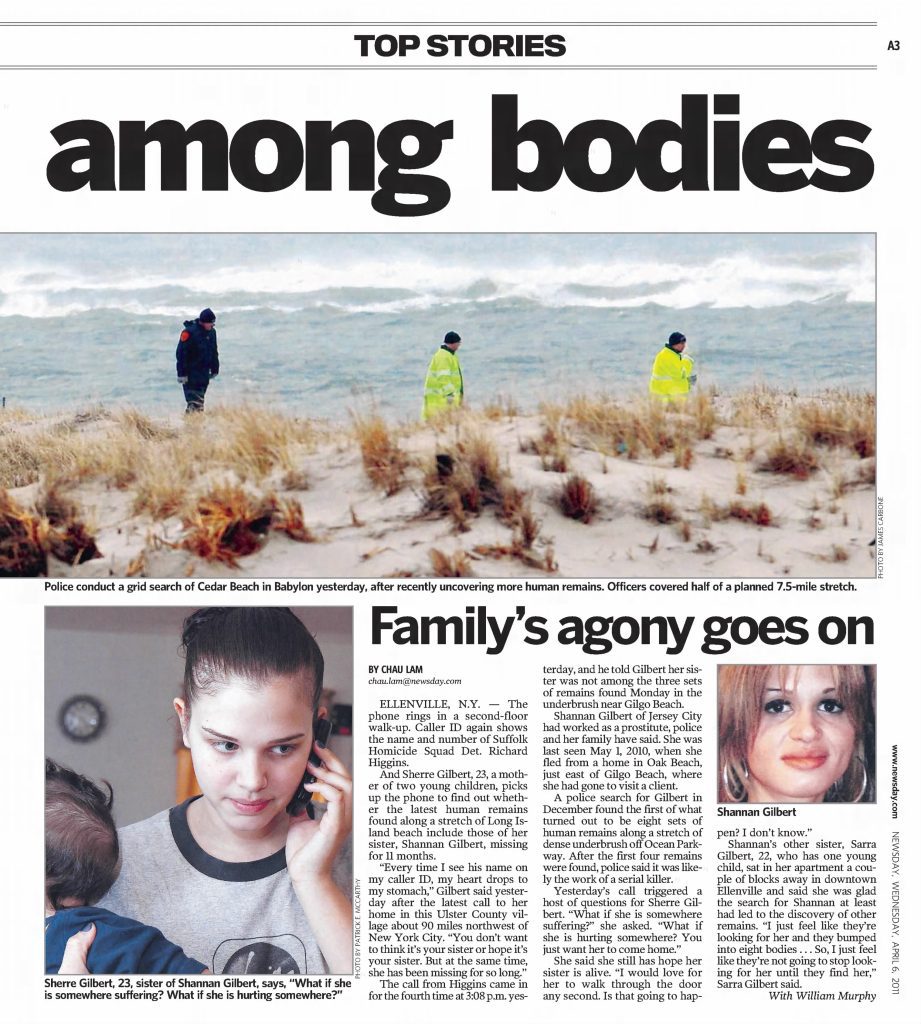 Gilbert, who had been working as an escort, was reported to have fled from a client’s home in a state of distress. Her remains were eventually found in a wooded area in Oak Beach, Long Island, in December 2011.