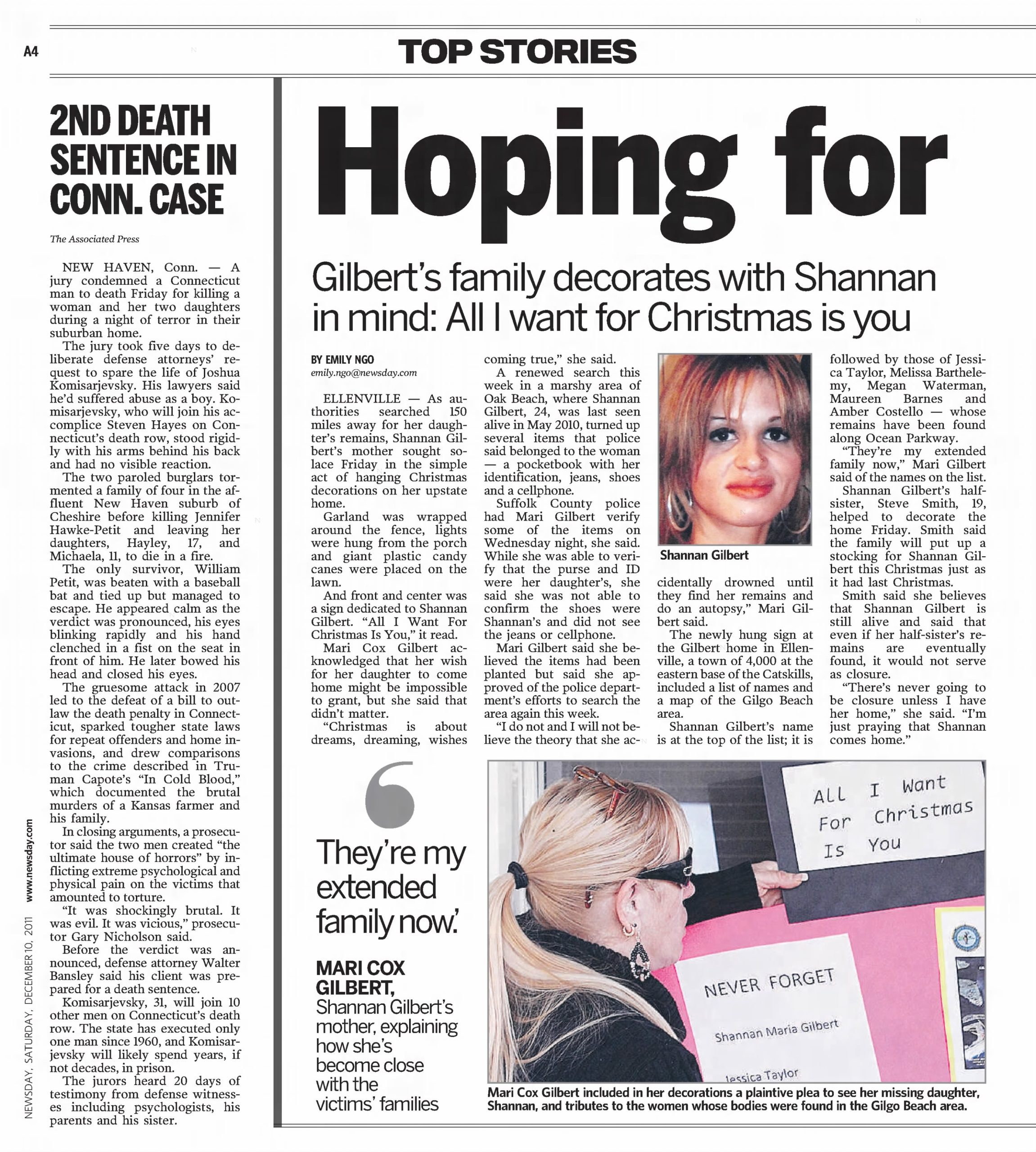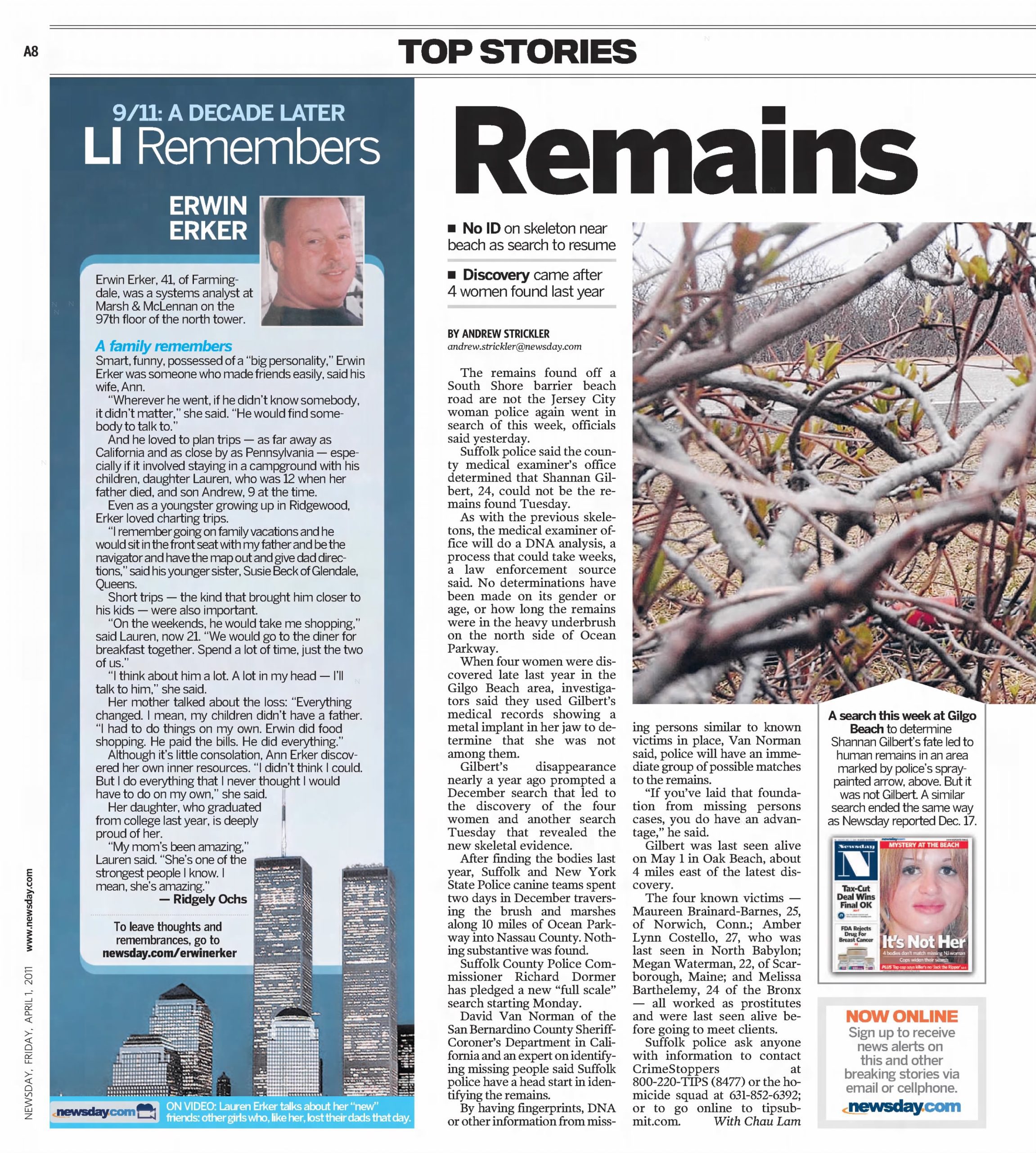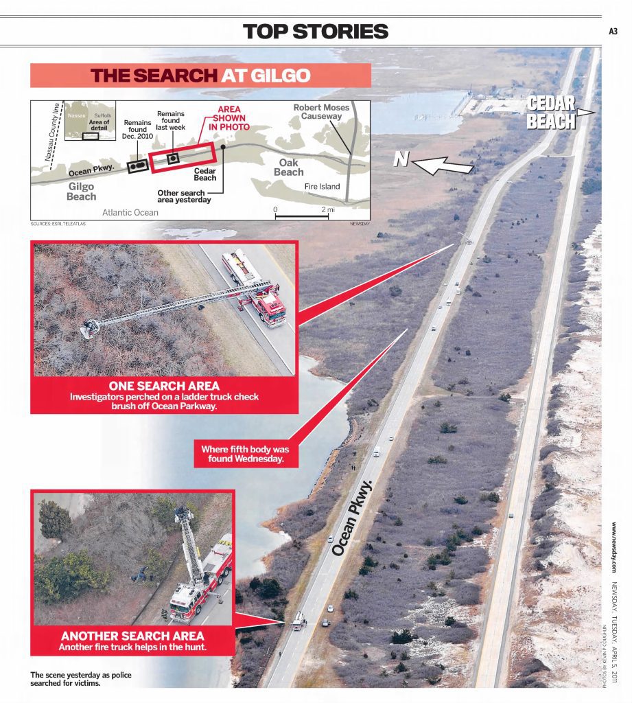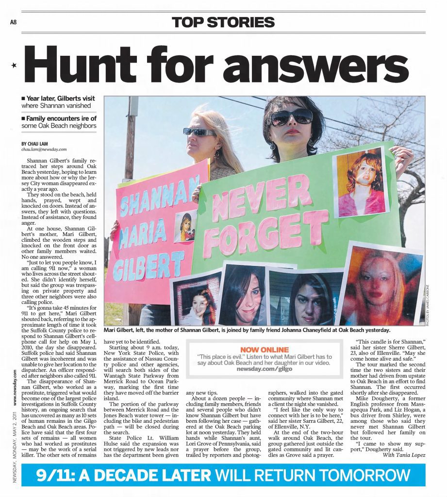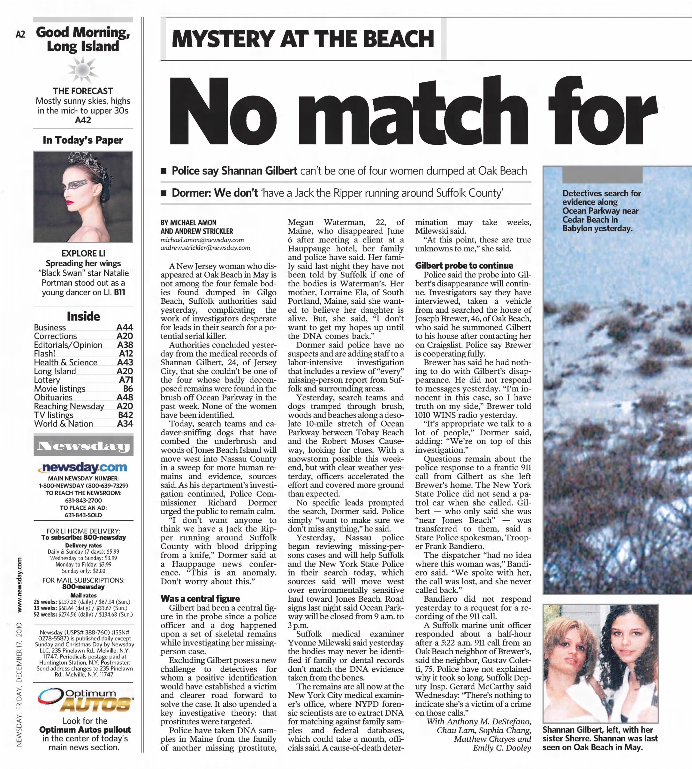 Gilbert, who had been working as an escort, was reported to have fled from a client’s home in a state of distress. Her remains were eventually found in a wooded area in Oak Beach, Long Island, in December 2011.