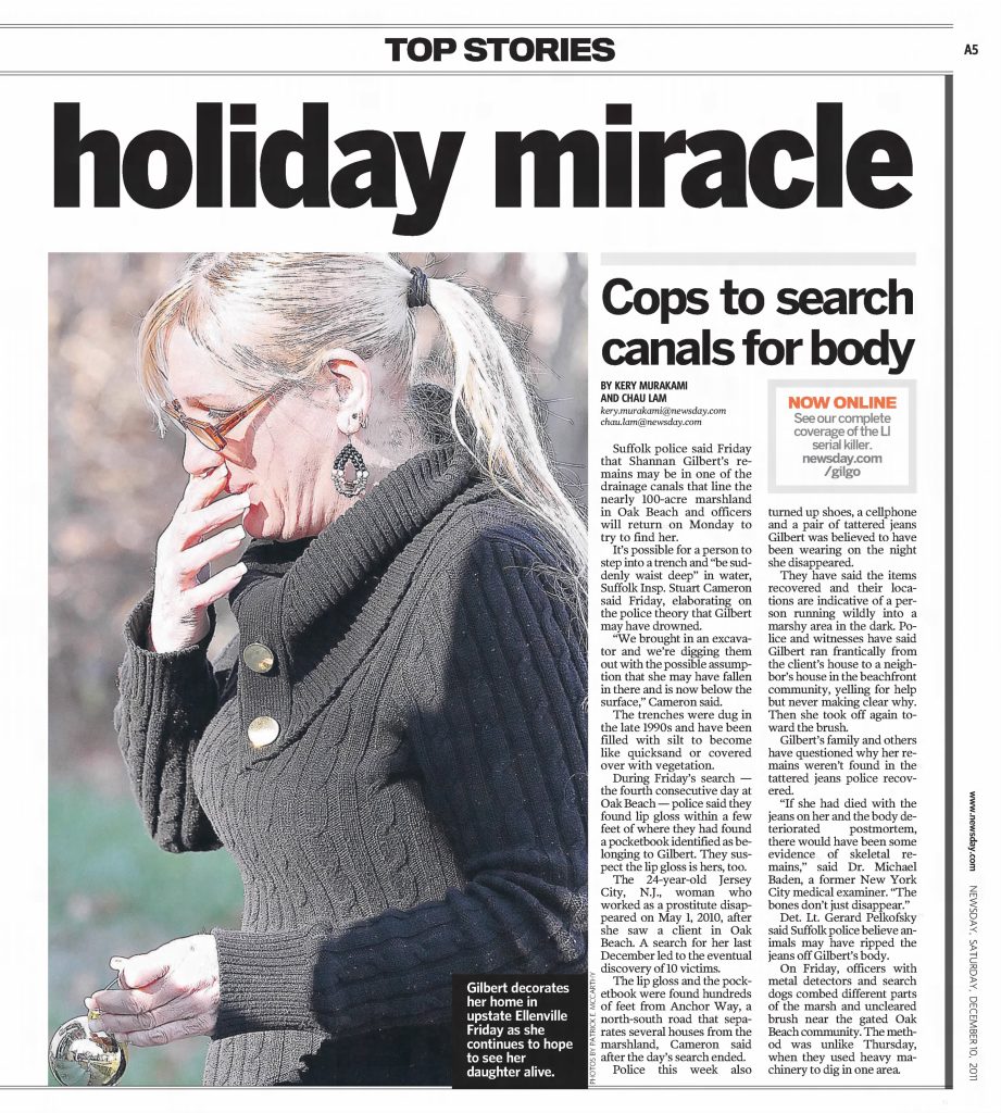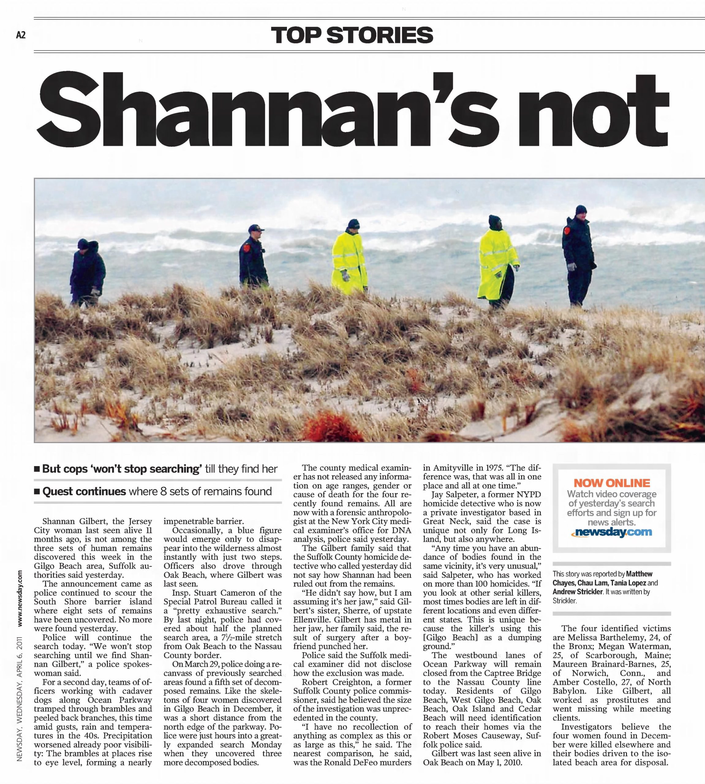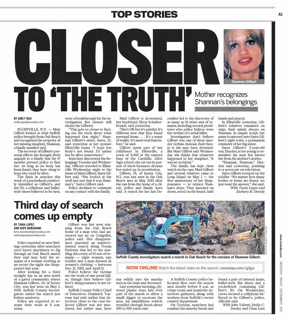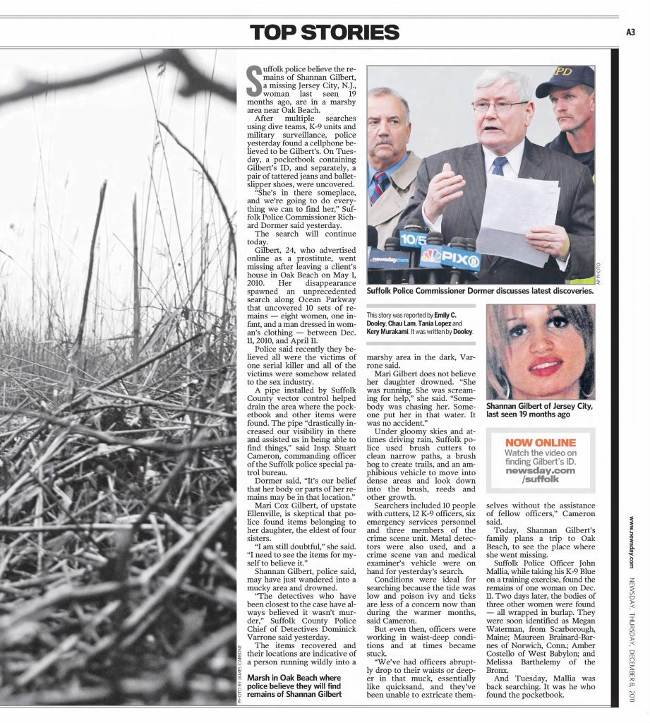 On December 13, 2011, police announced that the remains of Shannan Gilbert had been found in a marsh about half a mile from where she had disappeared. A week earlier, some of her clothing and belongings had been discovered in the same vicinity.
