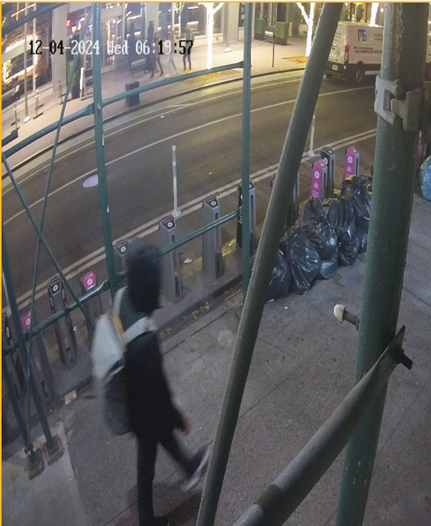 The hooded individual, dressed in the same black clothes with a light-colored Peak Design’s Everyday Backpack, as that of a man at the scene, is seen leaving the 57th Street F train station at 6:15am. The suspect proceeds to walk down the east side of Sixth Avenue toward the Hilton Hotel. Video