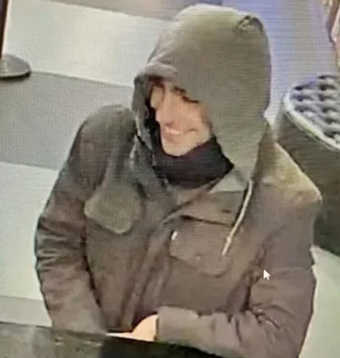 - The suspect, wearing a hooded sweatshirt and carrying a distinctive gray backpack, purchased coffee, water, and granola bars.