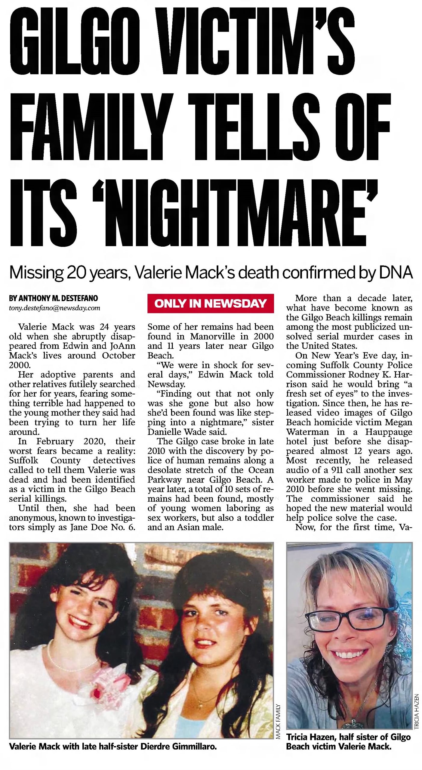 - April 4, 2011: Valerie’s head, hands, and right foot are discovered in a plastic bag along Ocean Parkway on Gilgo Beach, Long Island. Valerie Mack’s death would have occurred, more specifically, on or about and between September 1, 2000, to November 19, 2000.