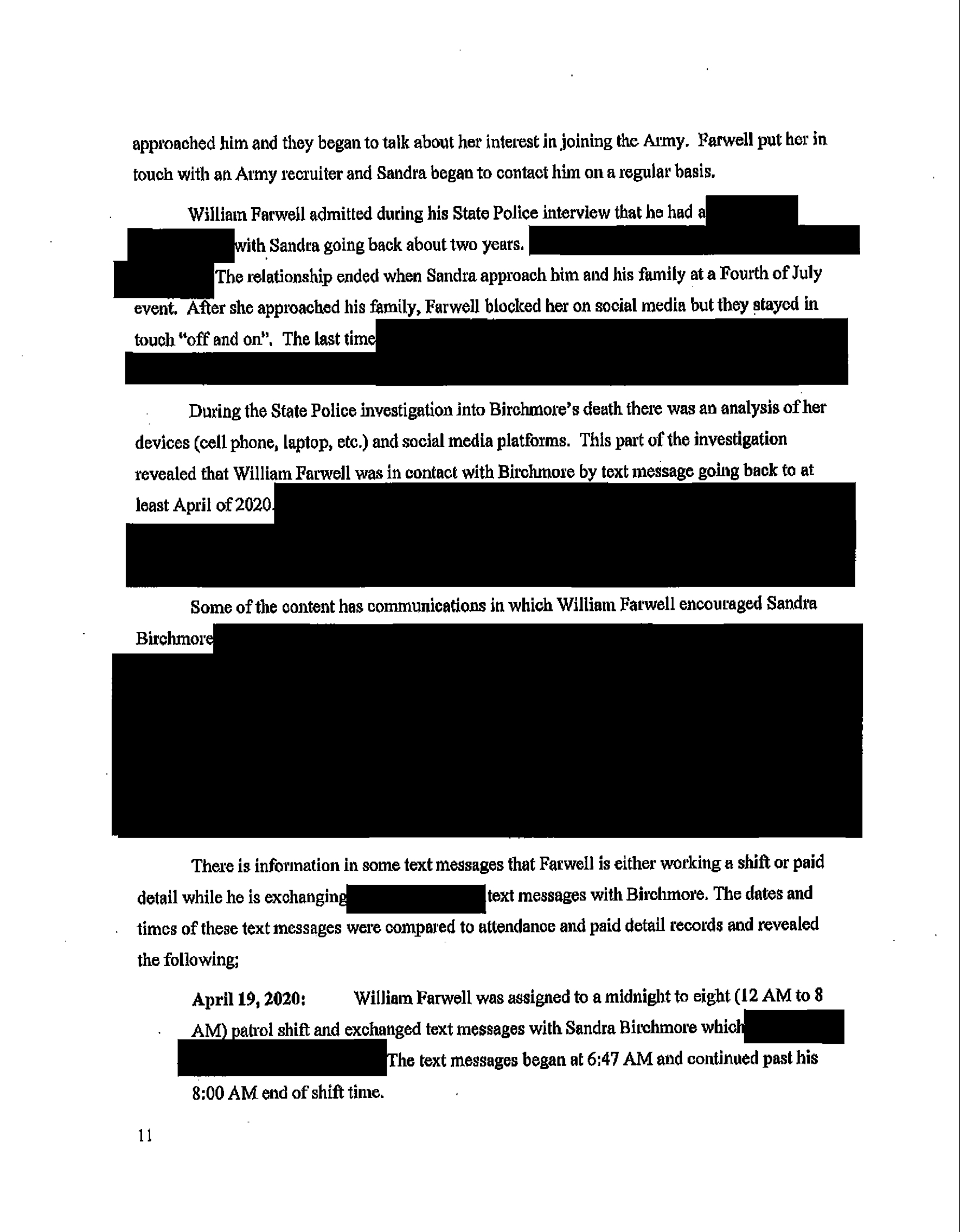 • Matthew Farwell came to see Sandra. Birchmore was found dead February 4 2021 three days after Matthew Farwell was the last one who saw Sandra alive. and had told friends that she was pregnant with Matthew Farwell’s child. Matthew Farwell denied that the baby was his, and he was the last to see Sandra alive.  Farwell told troopers he visited Birchmore’s apartment on the evening of Feb. 1, 2021, telling her that he wasn’t the father of her baby, records show. Birchmore was upset, Farwell told the troopers, but didn’t make “any suicidal statements.” “Matt said that he was straightforward in his conversation with her, and told her that it was all over and he was blocking her from all forms of communication,” Fanning wrote. Surveillance footage from Birchmore’s apartment complex showed Farwell entering her apartment building and then exiting 28 minutes later.