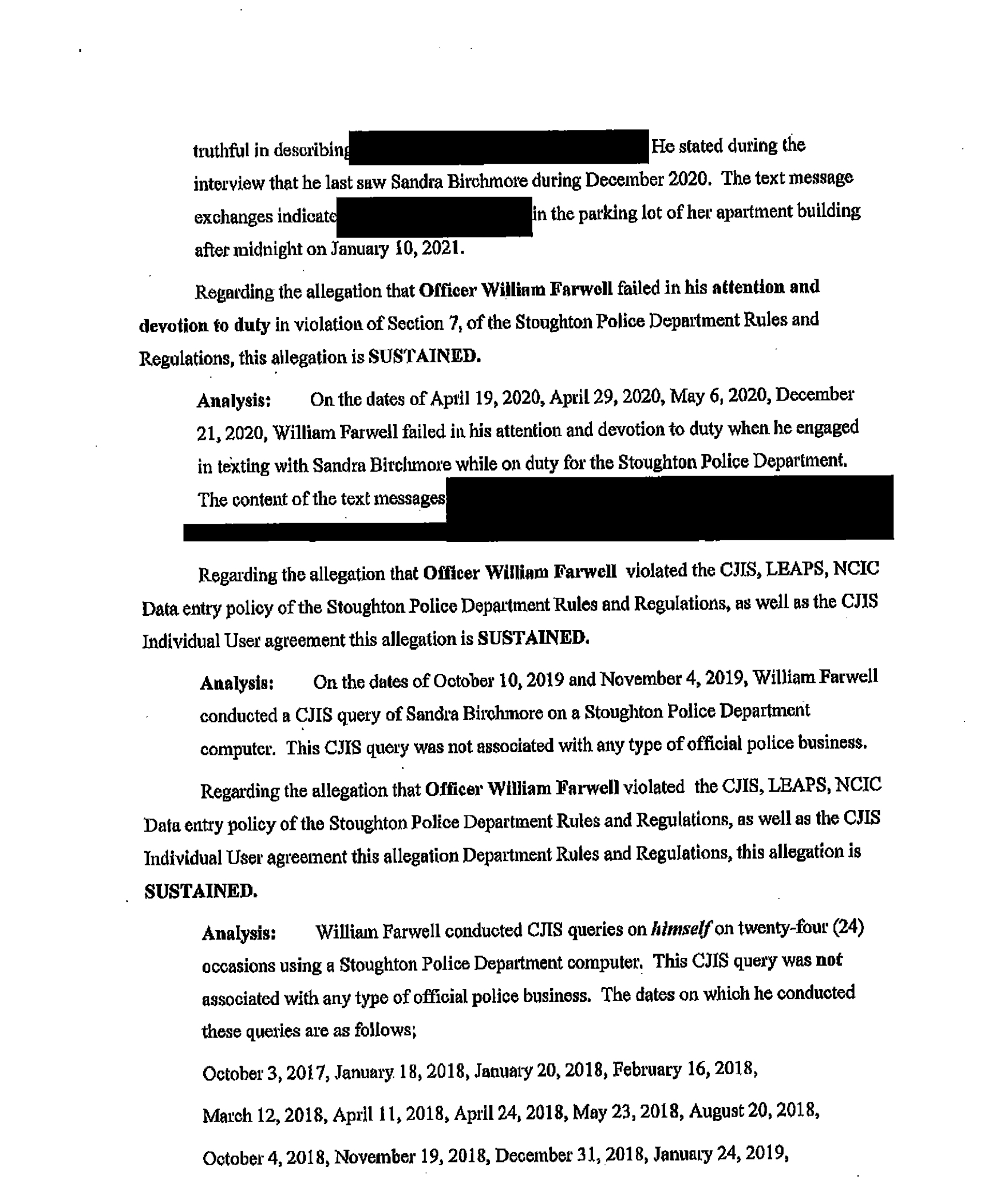 • Stoughton Police Department reveals misconduct by Farwell brothers, Devine in internal affairs report The department released a redacted report on its 19-month investigation, which found that Matthew and William Farwell and Devine had “inappropriate” relationships with Birchmore, but didn’t specify the sexual nature of the misconduct.